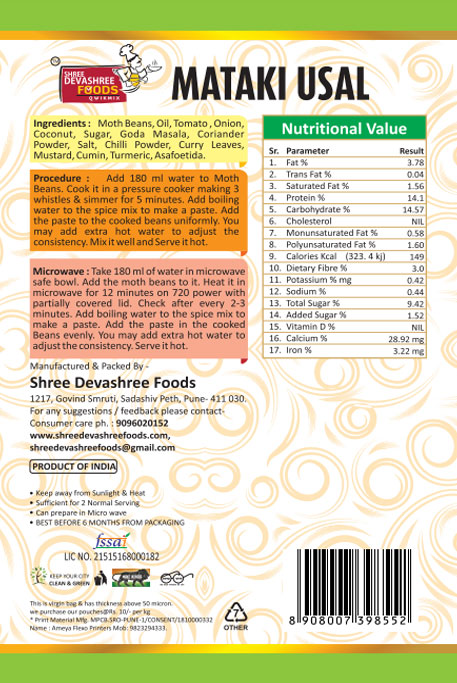 Moth Beans, Oil, Tomato, Onion, Coconut, Sugar, Goda Masala, Coriander Powder, Soil, Chili Powder, Curry Leaves, Mustard, Cumin, Turmeric, Asafoetida.